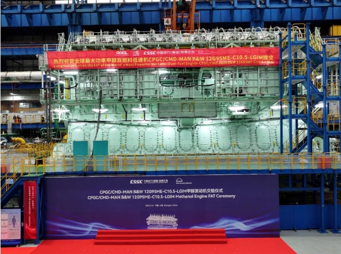 5月15日,中船集團旗下中船動力與MAN ES聯(lián)合舉辦的CPGC/CMD-MAN B&W 12G95ME-C10.5-LGIM-EGRTC甲醇發(fā)動機工廠驗收測試(FAT)交驗儀式在中船動力下屬中船三井成功舉行。