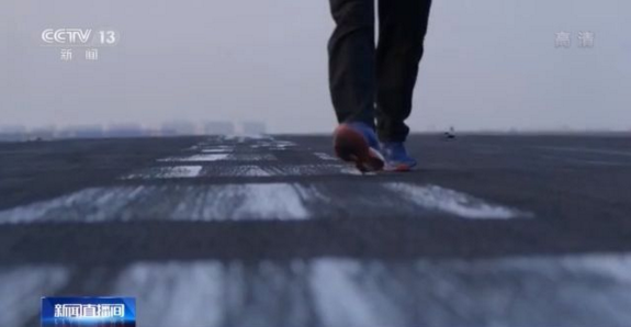 總臺央視記者 李寧:我現(xiàn)在是在海軍艦載航空兵某部,現(xiàn)在已經(jīng)有戰(zhàn)斗機進入飛行甲板,這個甲板是按照航母1:1來建造的。