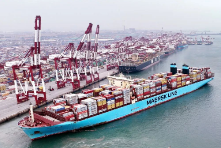 ▲在山東港口青島港前灣碼頭,歐洲貿易航線的“美途馬士基”集裝箱貨輪解纜起航(2022年7月29日攝,無人機照片)。新華社記者 李紫恒 攝