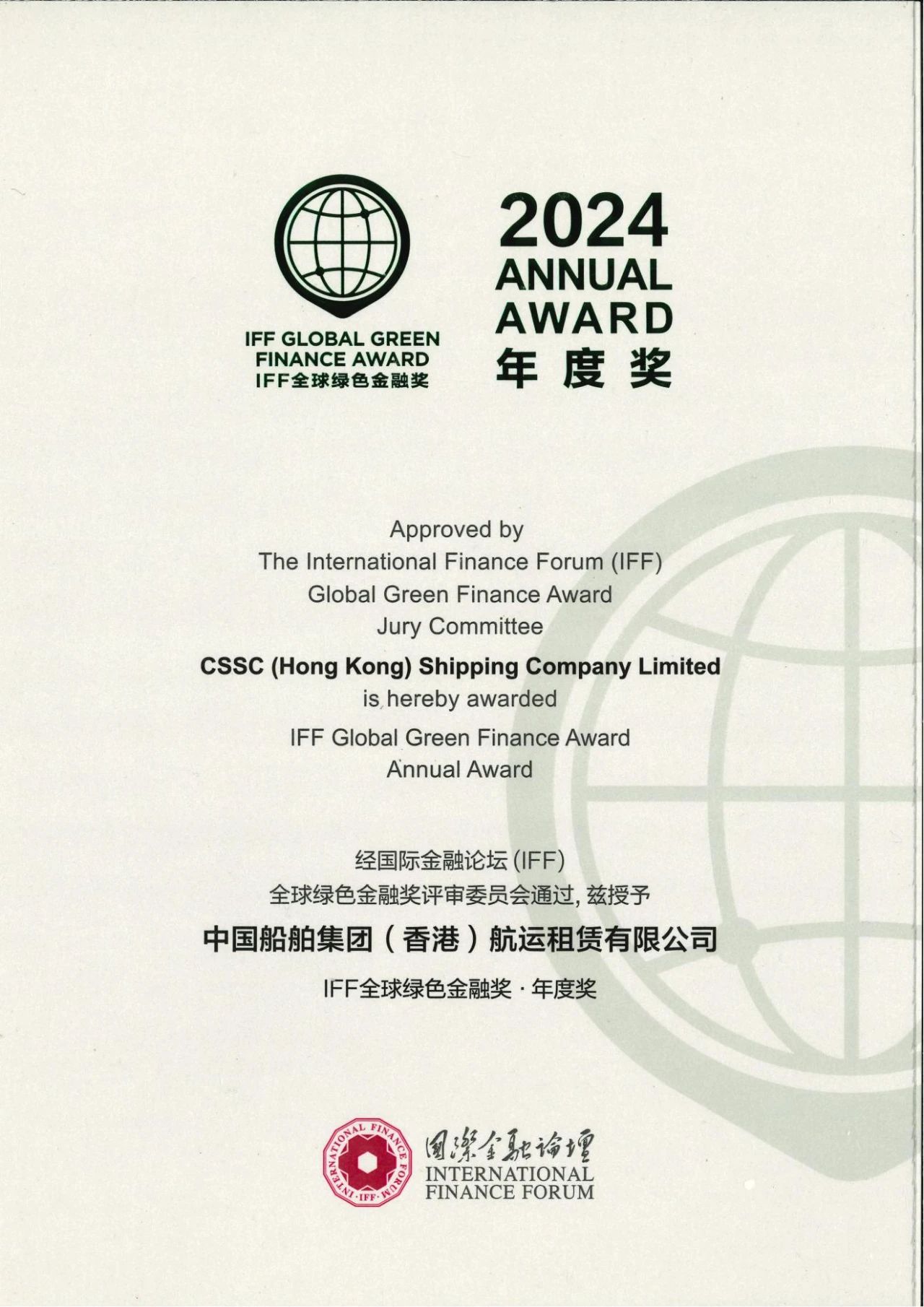 日前,在中國(guó)香港舉行的國(guó)際金融論壇(IFF)第21屆全球年會(huì)(F20峰會(huì))上,發(fā)布了第五屆“IFF全球綠色金融獎(jiǎng)”評(píng)選結(jié)果。中國(guó)船舶集團(tuán)中船租賃憑借其在綠色金融領(lǐng)域綜合實(shí)踐的杰出表現(xiàn),首度榮膺“IFF全球綠色金融獎(jiǎng)——年度獎(jiǎng)”。這是繼2021年獲得“IFF全球綠色金融創(chuàng)新獎(jiǎng)”,中船租賃再上一層樓,榮獲年度大獎(jiǎng)。