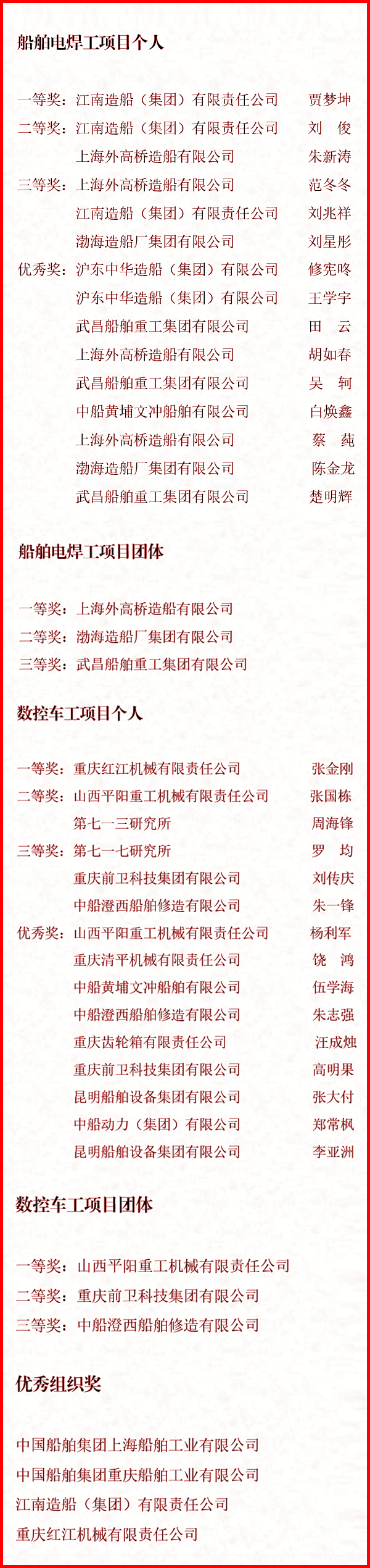本次競賽是中國船舶集團有限公司組建以來舉辦的首屆職業技能競賽,競賽項目既有船舶行業主體工種——船舶電焊工,又有現代制造業重要工種——數控車工。競賽由上海公司、江南造船、重慶公司、重慶紅江等四家單位承辦。參賽選手們相互學習交流、深入切磋技藝,展現了中國船舶技能人才頑強拼搏、追求卓越的良好精神面貌!
