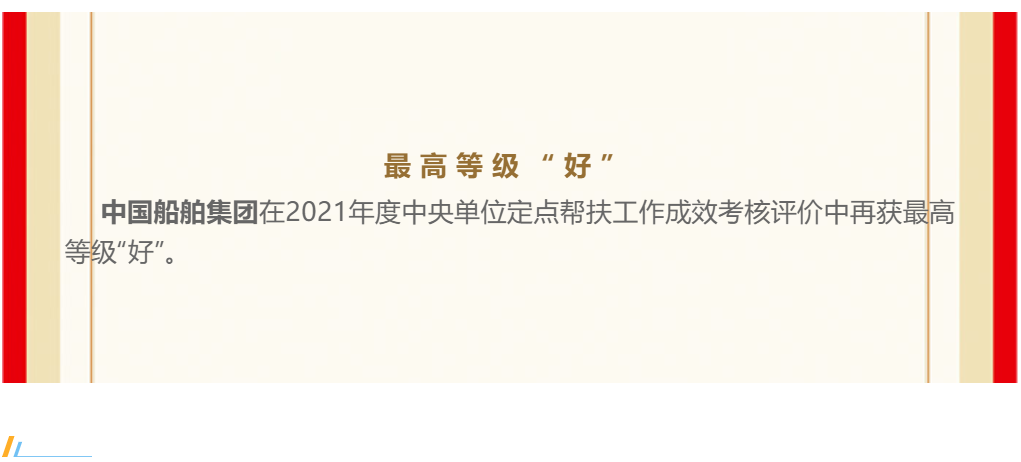 近日,中國船舶集團在2021年度中央單位定點幫扶工作成效考核評價中再獲最高等級“好”。這是自2019年組建成立以來,中國船舶集團連續第三年獲“好”。