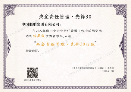 2022年12月20日,由國務(wù)院國資委社會責(zé)任局主辦、中國社會責(zé)任百人論壇承辦的“新征程 新責(zé)任——《中央企業(yè)社會責(zé)任藍皮書(2022)》《國資國企社會責(zé)任藍皮書(2022)》發(fā)布活動”在京舉行。活動以“云端會議”的方式舉辦,發(fā)布了“央企責(zé)任管理 · 先鋒30指數(shù)”,中國船舶集團入選該指數(shù)。