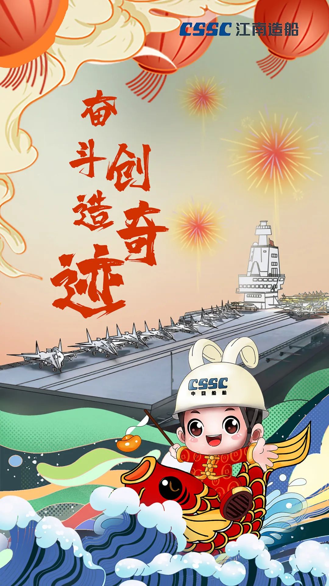 通過手繪藝術手法,將江南造船明星產品——福建艦和卡通形象——江小南融合在一起,長路漫漫,惟有奮斗!