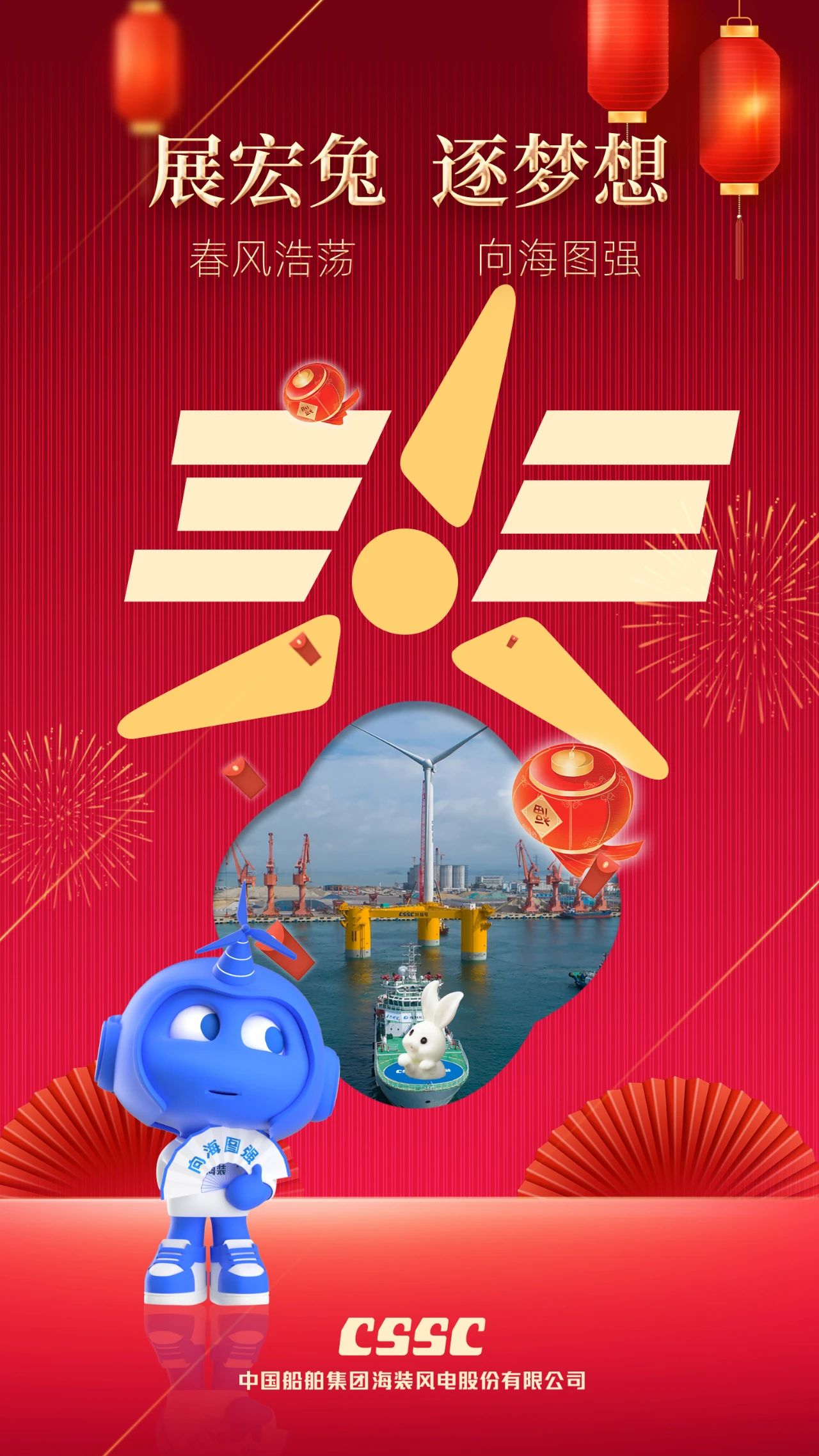 海報主體部分以國內首臺深遠海浮式風電裝備“扶搖號”為創意點,通過含有“大風車”形象的寫意“春”字,表達中船海裝將在春風浩蕩中大展宏“兔”,在向海圖強征程中矢志奮斗!