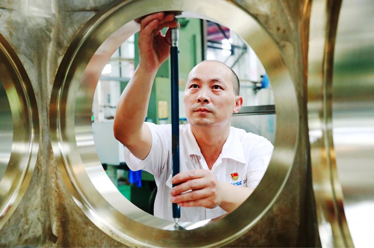 在武漢船機平臺生產(chǎn)現(xiàn)場,一名機床操作師傅,正在對加工后的零件進行檢測,專注的表情展現(xiàn)了船舶人嚴(yán)把質(zhì)量關(guān),人品以誠心為本,企品以恒心為要,產(chǎn)品以匠心為重的精神風(fēng)貌。