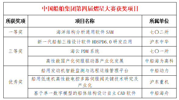 2025年1月3日,國務(wù)院國資委正式公布第四屆中央企業(yè)熠星創(chuàng)新創(chuàng)意大賽獲獎名單。中國船舶集團(tuán)參賽項(xiàng)目榮獲一等獎1項(xiàng)、三等獎3項(xiàng)、優(yōu)秀獎3項(xiàng),優(yōu)秀導(dǎo)師4名,集團(tuán)公司榮獲“優(yōu)秀組織單位”榮譽(yù)稱號。