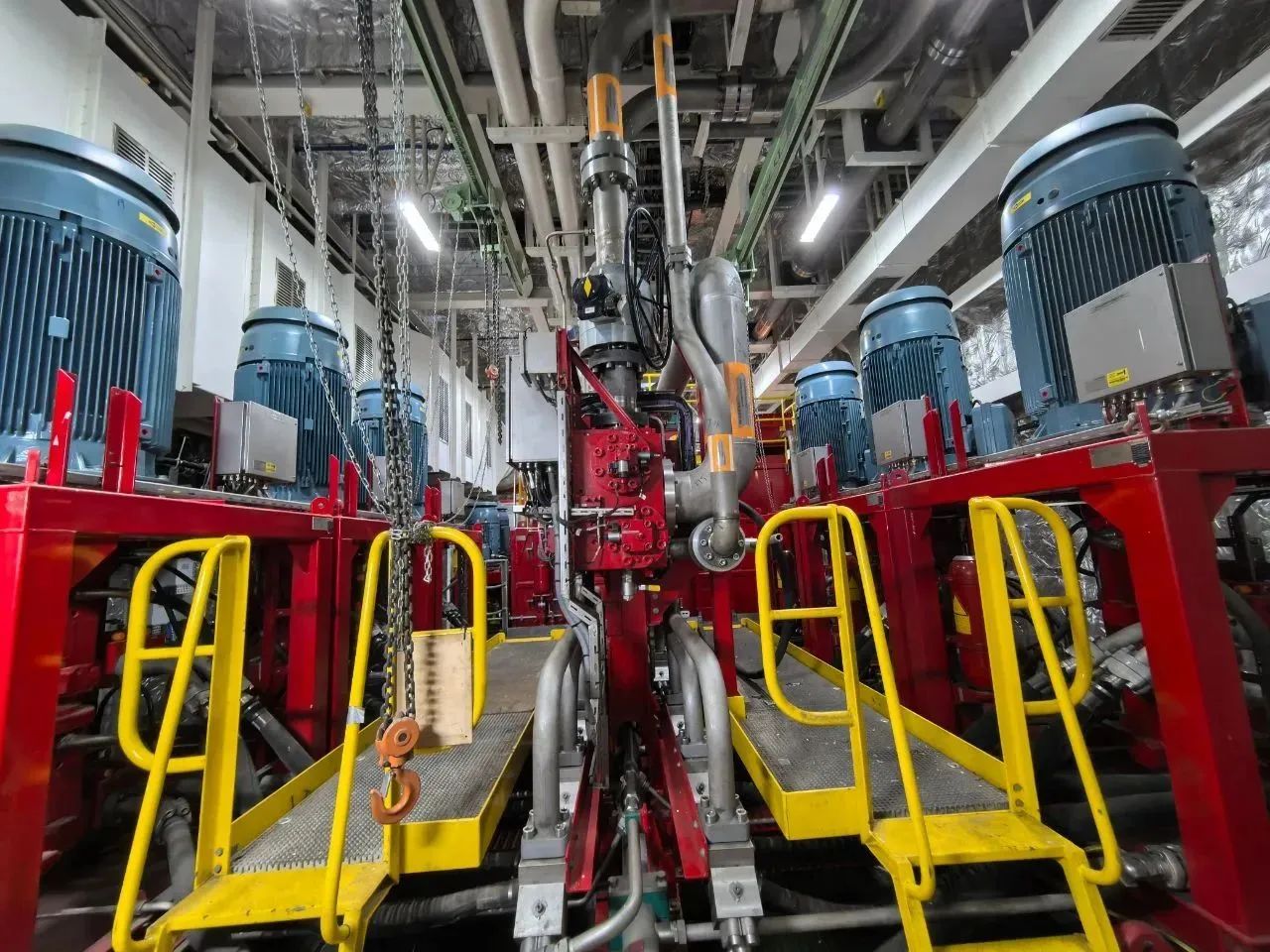 “夢想”號鉆井系統提升能力強、反應速度快,離不開配套的液壓提升系統。系統配有12臺泵,裝機容量達4100千瓦,高壓管路長達8000多米,直徑達270多毫米,最高壓力為350公斤/平方厘米,是家庭高壓鍋耐壓的175倍。