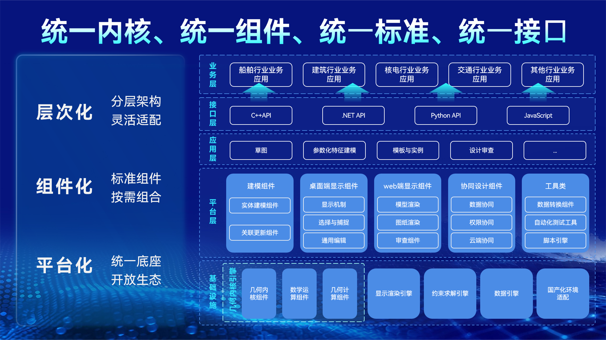 平臺確立了:統(tǒng)一內(nèi)核、統(tǒng)一組件、統(tǒng)一標準、統(tǒng)一接口的體系化架構(gòu)。