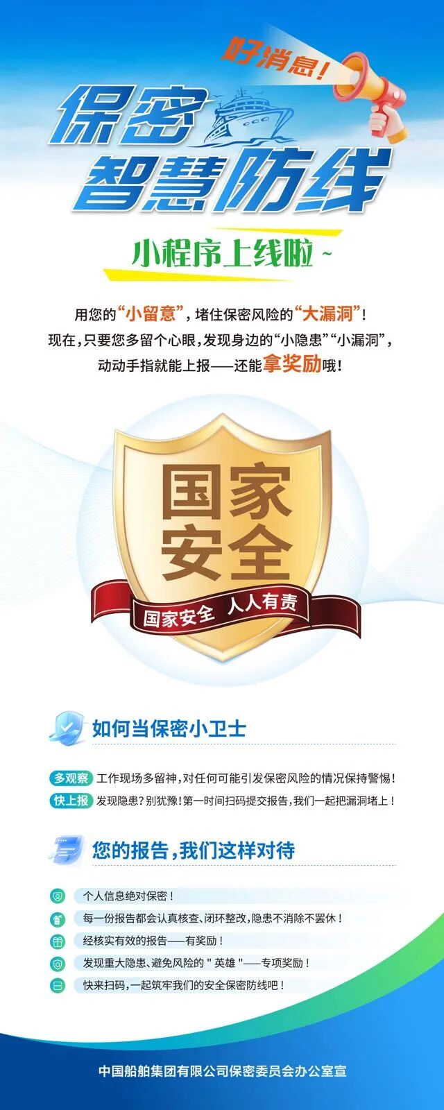 在第十一個全民國家安全教育日到來之際,為深入貫徹落實總體國家安全觀,中國船舶集團(tuán)有限公司“保密智慧防線”小程序正式上線運行。