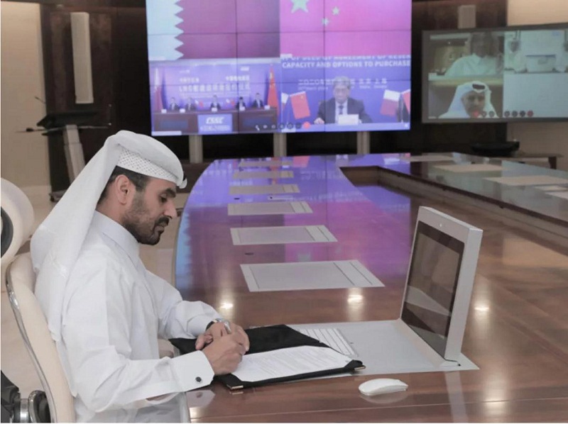 ????雖然全球疫情持續蔓延,但“一帶一路”建設的步伐并未停滯。4月22日,中國船舶集團有限公司與卡塔爾石油公司在中國北京、上海及卡塔爾多哈三地以“云簽約”方式聯合簽署“中國船舶—卡塔爾石油液化天然氣(LNG)船建造項目”協議,所涉訂單總金額超過200億元人民幣。這是卡塔爾天然氣項目首批訂單,也是中國船企迄今承接的金額最大的造船出口訂單。中國船舶集團董事長雷凡培、卡塔爾能源事務部長兼卡塔爾石油總裁薩阿德?謝里達?阿爾卡比出席簽約儀式并分別代表雙方在協議文本上簽字,中國船舶集團副總經理孫偉主持簽約儀式,卡塔爾天然氣公司首席執行官卡利德?阿爾?塞尼、卡塔爾石油商務開發執行副總裁賈西姆?阿爾馬拉祖齊等出席簽約儀式。