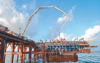 7月6日,隨著主橋23號墩承臺最后一車混凝土的澆筑,中國援馬爾代夫中馬友誼大橋5個主橋承臺全部施工完成,標志著占全橋施工總量約70%的主橋部分從此徹底擺脫印度洋的強涌浪襲擾,進入上部結構施工階段。