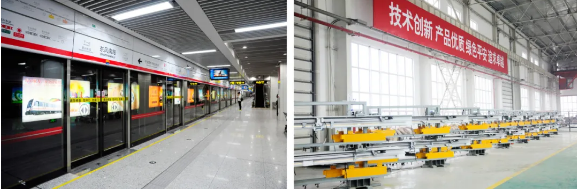 左圖:鄭州地鐵1號(hào)線使用七一三所軌道交通站臺(tái)門(mén)系統(tǒng);右圖:七一三所軌道交通站臺(tái)門(mén)門(mén)機(jī)系統(tǒng)生產(chǎn)現(xiàn)場(chǎng)