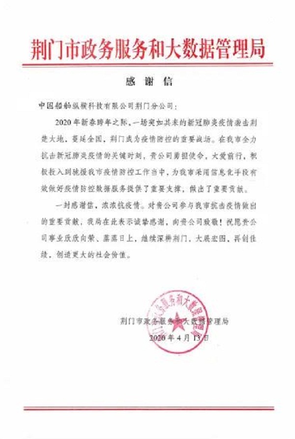 ????中國船舶集團七一〇所縱橫公司荊門分公司收到荊門市政務服務和大數(shù)據(jù)管理局寄來的感謝信,感謝其在抗擊新冠肺炎疫情的關(guān)鍵時刻,為荊門市采用信息化手段有效做好疫情防控數(shù)據(jù)服務提供了重要支撐,作出了重要貢獻。