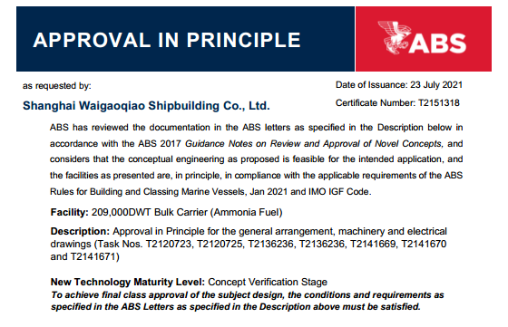 日前,中國(guó)船舶集團(tuán)旗下外高橋造船自主研發(fā)設(shè)計(jì)的21萬(wàn)噸氨燃料動(dòng)力散貨船獲得美國(guó)船級(jí)社(ABS)頒發(fā)的原則性認(rèn)可證書(shū)(AIP)。作為具有潛力的零碳燃料,氨燃料能滿足更加嚴(yán)格的溫室氣體排放要求,是未來(lái)脫碳航運(yùn)業(yè)中最有希望的替代燃料之一。氨燃料動(dòng)力船型的推出,為航運(yùn)業(yè)提供一種零碳運(yùn)輸?shù)沫h(huán)保新方案。