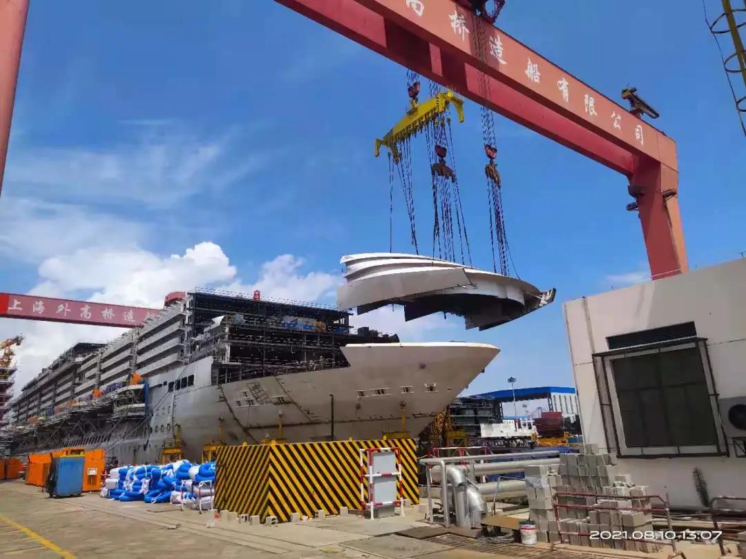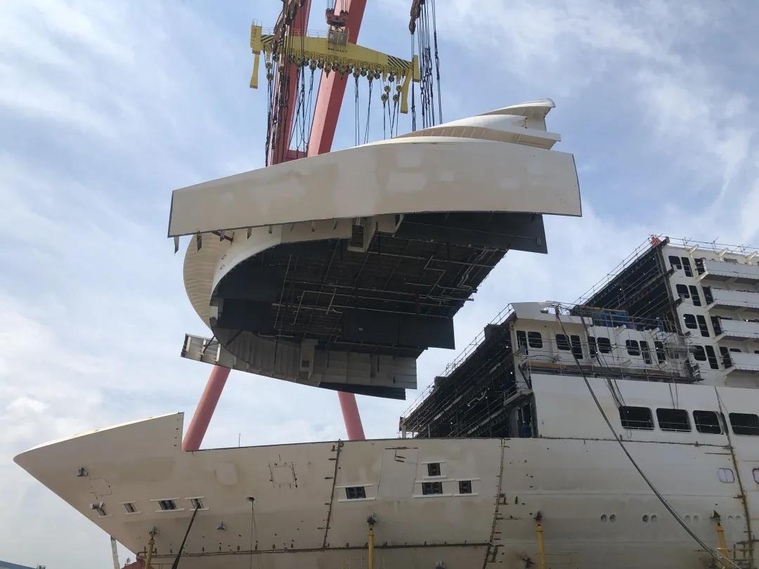 這標(biāo)志著國產(chǎn)首制大型郵輪正式開啟艏部吊裝模式,9月份將實現(xiàn)全船結(jié)構(gòu)貫通這一里程碑節(jié)點。