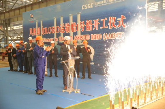 10月24日,中國船舶集團旗下武昌造船為法國路易達孚航運集團公司(LDA)建造的風帆助力滾裝(RORO)運輸船首制船順利開工。