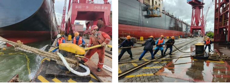 臺風來臨前,聞“風”而動。緊急為單船加纜,將水上設備移入港池避風,拆除全部應急梯,對纜樁開展地毯式排查,預先部署防臺橫纜,筑牢前置防線。針對受風面積大的大型集裝箱船等重點產(chǎn)品,升級加固措施,加裝高強度纜繩等,為巨輪系緊“安全鎖”。