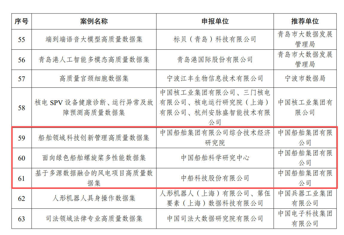 近日,國家數據局在2025中國國際大數據產業博覽會上發布了首批104個高質量數據集典型案例。中國船舶集團有限公司旗下綜合院申報的“船舶領域科技創新管理高質量數據集”、七〇二所申報的“面向綠色船舶的螺旋槳多性能數據集”、中船科技申報的“基于多源數據融合的風電項目高質量數據集”成功入選并發布。