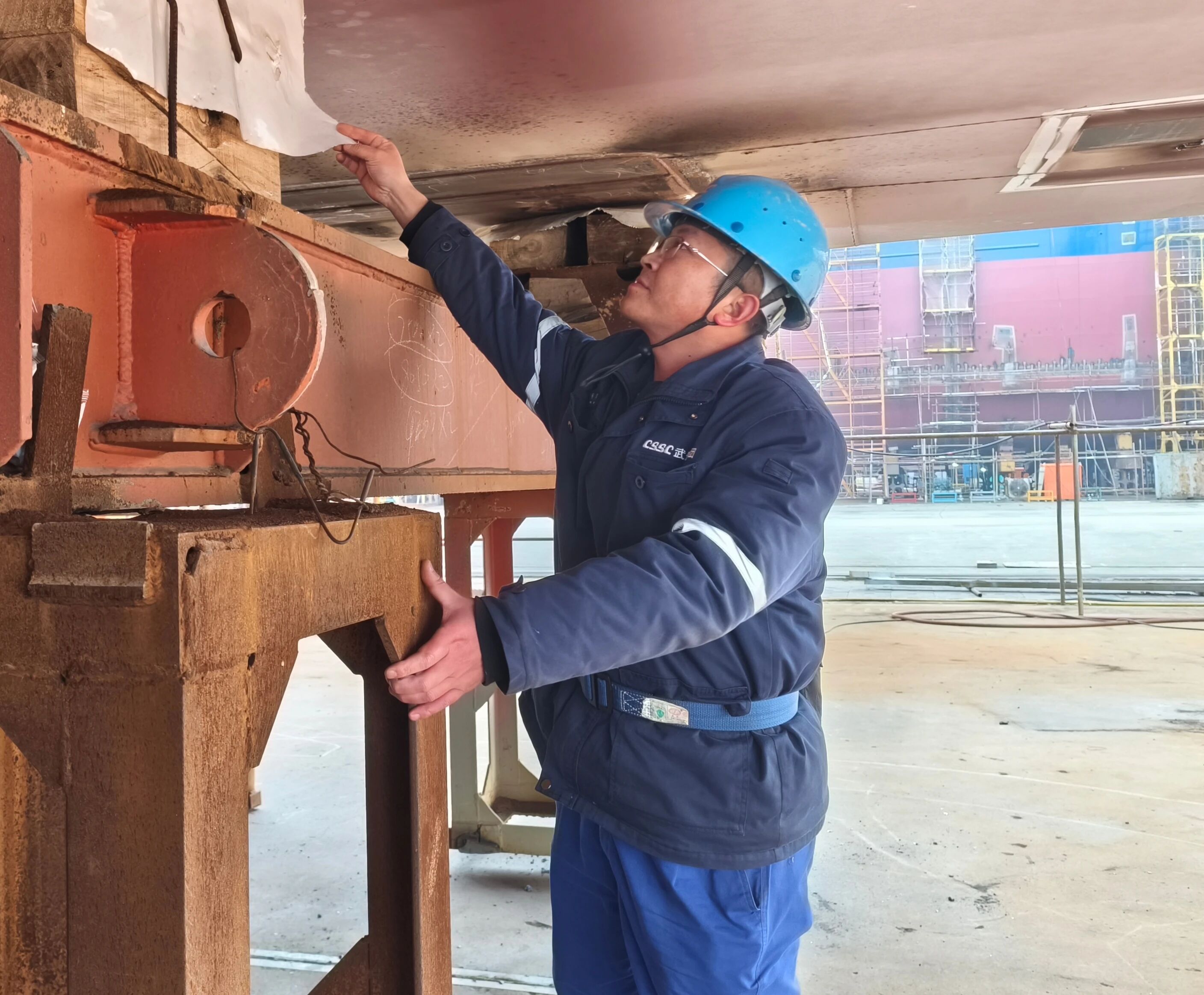 2025年7月3日上午,中國船舶集團(tuán)有限公司旗下武昌造船,某船臺(tái)安全通道附近。