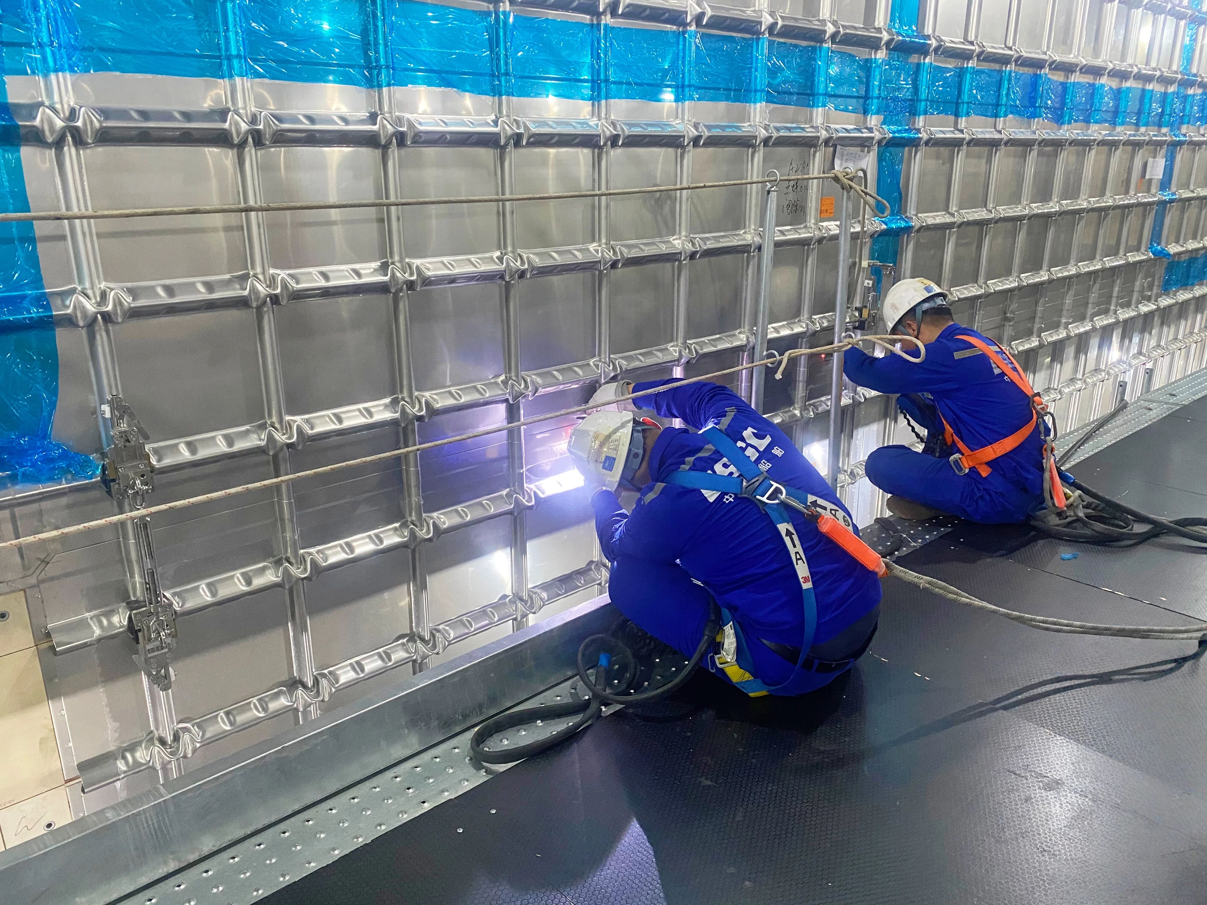 在大連,工程公司一工廠船體作業(yè)區(qū)產(chǎn)能同比提升30%;LNG項目組成功解決了薄板焊接變形、焊縫成形不均等技術(shù)瓶頸,并順利交付兩個液貨艙的貨圍階段氨氣試驗施工任務(wù),質(zhì)量檢測結(jié)果超行業(yè)第一梯隊平均水平。