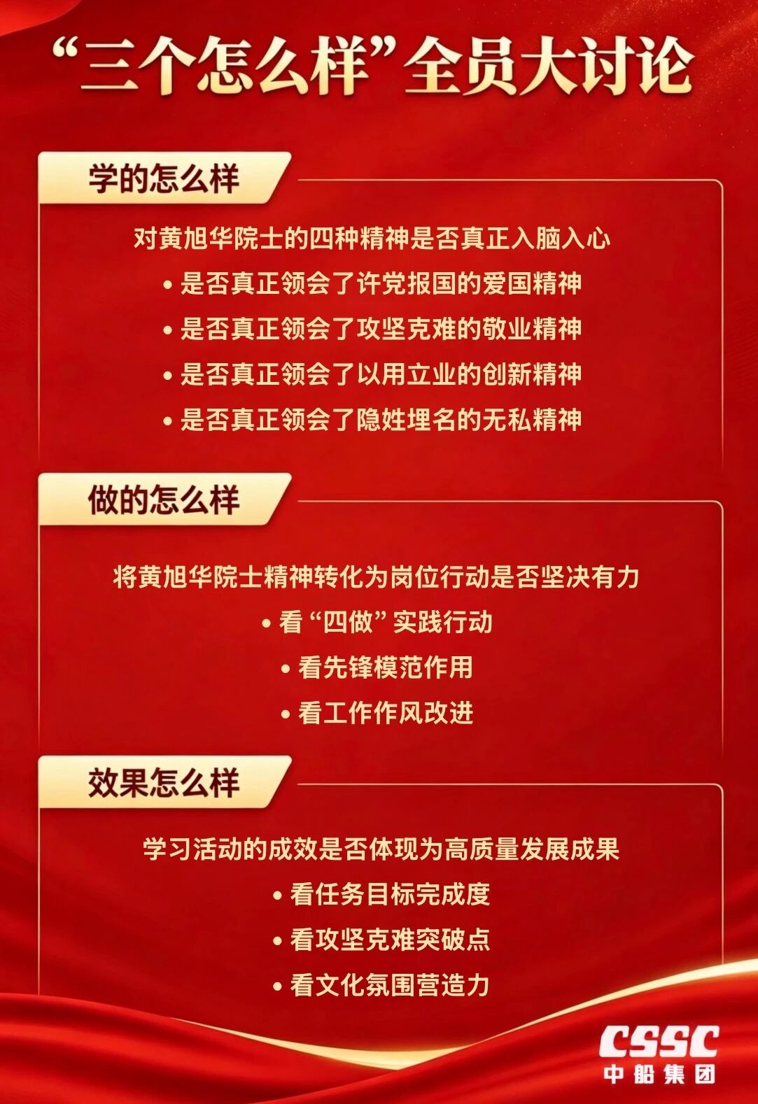近日,中船集團(tuán)黨組下發(fā)通知,號(hào)召全集團(tuán)開展學(xué)習(xí)黃旭華院士先進(jìn)事跡“四學(xué)四做”活動(dòng)“三個(gè)怎么樣”(學(xué)的怎么樣、做的怎么樣、效果怎么樣)全員大討論。